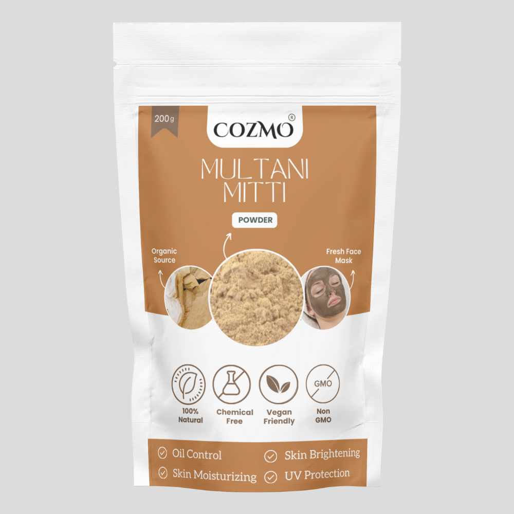 Experience the natural goodness of pure botanicals with **Cozmo Multani Mitti Powder**, your all-in-one solution for purified, balanced, and refreshed skin. Rich in natural minerals and known for its powerful detoxifying properties, this ultra-fine clay works to absorb excess oil, unclog pores, soothe irritation, and enhance overall skin texture. Perfect for DIY face masks, daily skincare rituals, and for anyone seeking a clean, mattified, and glowing complexion without chemicals or additives.